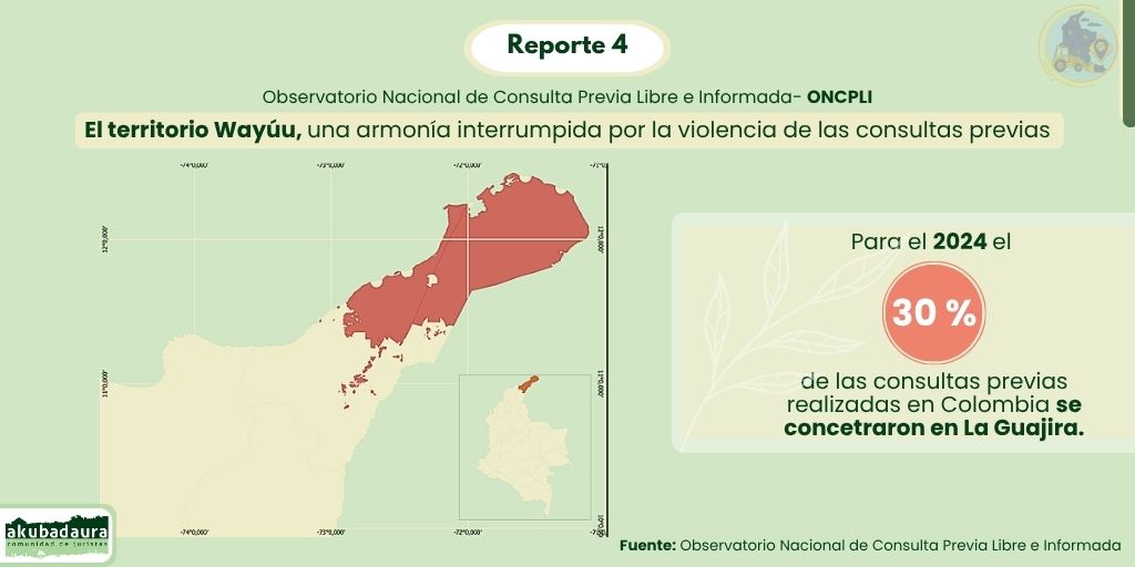 Entre 2005 y 2024 se realizaron más de 4.200 procesos de consulta previa con comunidades Wayúu, lo que arroja un promedio de 223 consultas anuales durante 19 años consecutivos. El 80 % de estos procesos corresponden a los sectores eléctrico, minero e hidrocarburos y se concentran en los municipios de Uribia, Maicao y Riohacha. Este periodo ha estado marcado por la fragmentación del territorio ancestral, debido a barreras físicas como la Ciudadela del Cerrejón, que alberga a más de 10.000 empleados, parques solares y eólicos con aerogeneradores de hasta 120 metros de altura, e infraestructura de transmisión eléctrica que recorre todo el departamento, además de la contaminación y privatización de fuentes hídricas, la vulneración de la soberanía alimentaria y graves hechos de violencia, como asesinatos selectivos y masacres.
