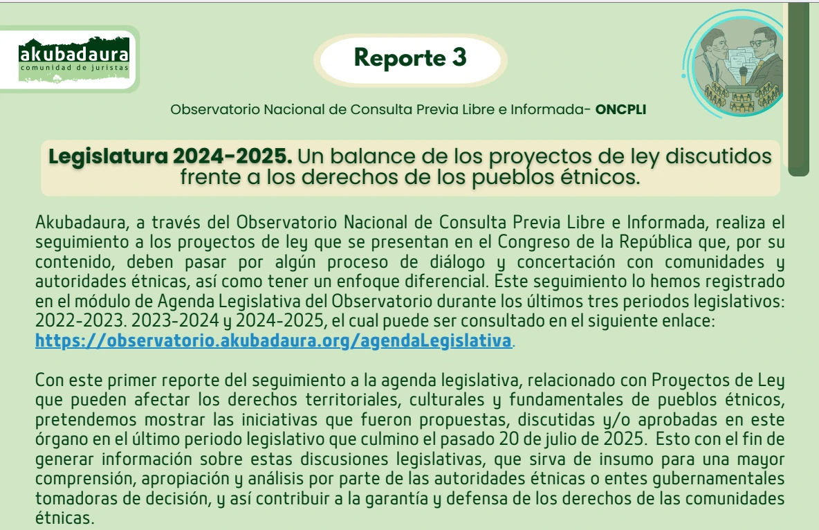 Akubadaura, a través del Observatorio Nacional de Consulta Previa Libre e Informada, realiza el seguimiento a los proyectos de ley que se presentan en el Congreso de la República
